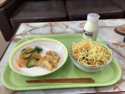キムチラーメン、揚げ餃子、華風漬け、牛乳です。
