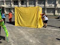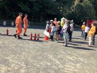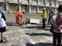 自治会ごとに、煙体験、瓦礫からの救助用ジャッキの使用法、消火器訓練を体験していました。ボランティアの生徒も、作業の合間に体験。そうそう、今回来てくれた生徒たち、自主的に仕事を探して動ける素晴らしい子たち!お褒めいただきました。