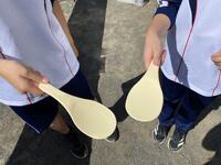 ボランティアの和田中生が炊き出して使用した大きなしゃもじをもらって喜んでいます。
