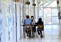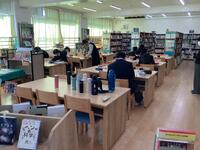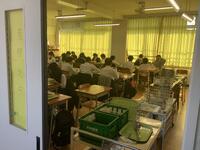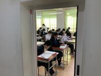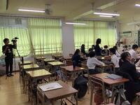 定期考査の時間を使って、5組は練習してきた面接を本番同様に体験しています。写真は待合室の様子です。ここでに過ごし方も面接の一部ということがわかっている生徒たちは有意義な時間をそれぞれが過ごしています。