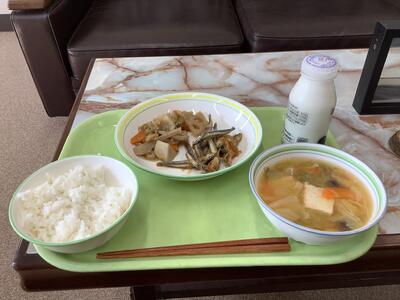 きびなごのねぎソース、根菜のそぼろ煮、キャベツの味噌汁、ご飯、牛乳です。