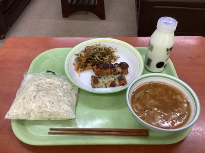 あんかけうどん、ちくわの磯辺揚げ、茎若布のごま炒め、牛乳です。