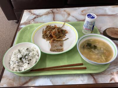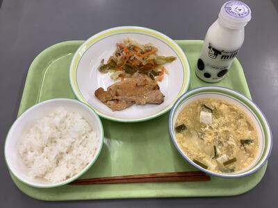 ご飯、かきたま汁、鶏肉の西京焼き、千切り野菜の炒め物、牛乳 です。