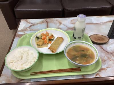 春巻、生揚げのオイスターソース、中華スープ、ご飯、牛乳です。