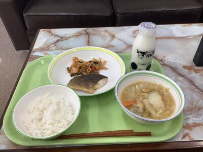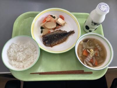 ほっけの文化干し、切り干し大根のピリ辛煮、野菜のごま汁、ご飯、牛乳です。
