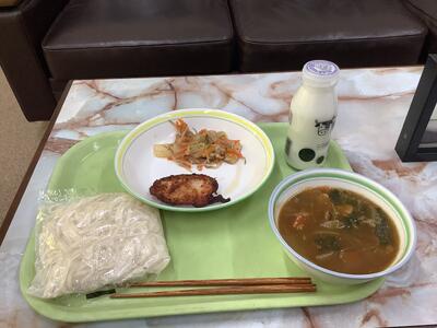 プルコギ丼、トックスープ、牛乳です。