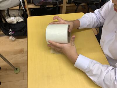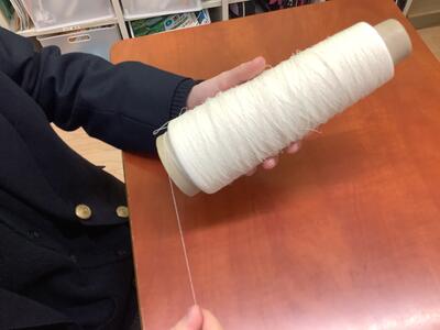 雑巾プロジェクトで会社の方からお話を聞きました。植物から作った和紙を糸にして雑巾の布を作る話に実物を触りながら熱心に聞いています。