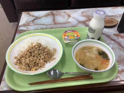 凍り豆腐のそぼろ丼、冬野菜の味噌汁、はちみつゆずゼリー、牛乳です。