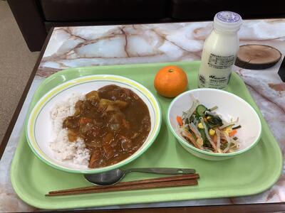 ポークカレー、海藻サラダ、みかん、牛乳です。