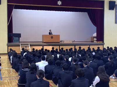 生徒会長、生活委員長、給食委員長からより良い学校生活のためのお話がありました。今年も残りわずかですが、生徒の手によって楽しい学校をつくっていこうと呼びかけてました。