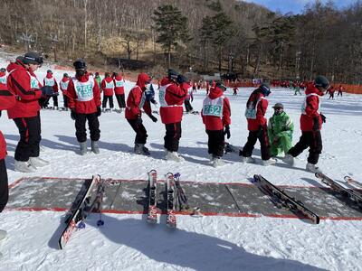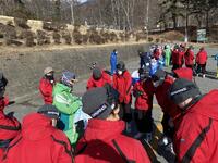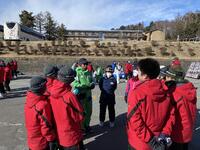 開校式前に行動が早いことをイントラの方に褒めていただきました。余った時間でブーツの履き方をレクチャーしてくださってます。