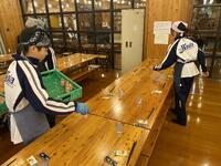 健康チェック後のカード提出。保健担当の先生と班員の様子を確認してます。