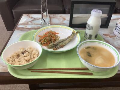 ししゃもの磯辺揚げ、ニラともやしの炒め物、かぶの味噌汁、鶏五目ご飯、牛乳です。