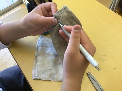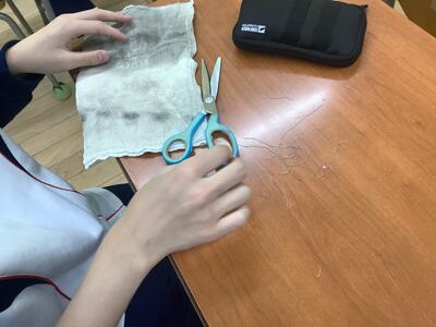 和紙からできた雑巾を使用してきましたが、今回はそれを土に返す工程に入ります。その前に糸を取り除いています。