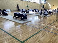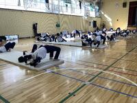 毎回、写真のような補強運動を行ってから主運動に入っています。柔軟運動と合わせて大切な要素ですが、できる生徒が多いと感じました。自分の課題に取り組む際に、クラスメイトとタブレットで撮影し合ったり学習カードに記録したりしています。考えて運動していることがよく分かります。