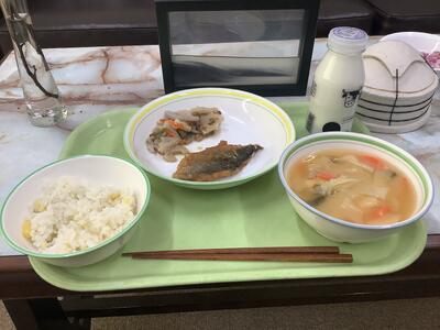 さばの塩焼き、筑前煮、野菜のごま汁、ご飯、牛乳です。