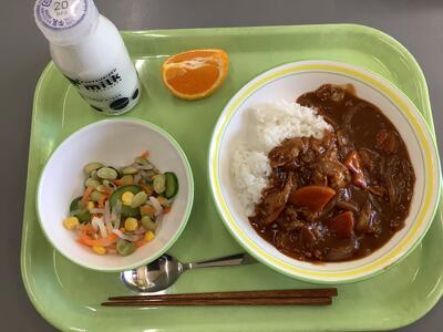 ハヤシライス、イタリアンサラダ(イタリアンドレッシング)、デコポン、牛乳 です。