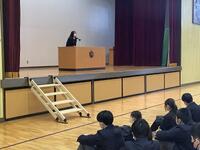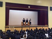 生徒会長からは考査、受験に向けての話とやり残したことやりきろうというメッセージが送られました。そして3月にあいさつ運動があることが伝えられました。生活委員からは身だしなみチェックの話があり、その後に防犯作文、アンサンブルコンテスト、卓球部の表彰をしました。生活指導主任から、今日の朝礼集合の素晴らしさへの御礼があり、その後2月のふれあい月間について、過ごしやすい学校生活について話しました。