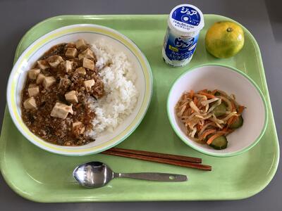 麻婆豆腐丼、中華サラダ、みかん、ジョアです。