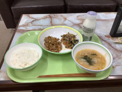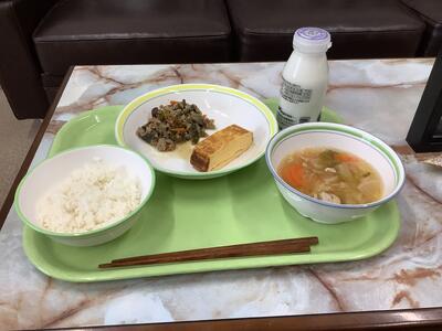 にらともやしの炒め物、大豆とじゃこの唐揚げ、大根の味噌汁、ご飯、牛乳です。