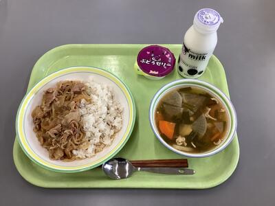 豚丼、のっぺい汁、ぶどうゼリー、牛乳です。