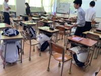 登校直後に地震が起きた想定です。しっかり身の安全を確保できている様子が見えます。先生たちも速やかな安全確認の情報伝達に走ります!