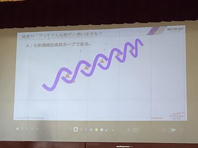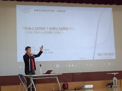 株式会社フーチャーアーティザンの社長様に自分の成長から働くことについて、具体例をもってお話くださりました。独特の成長曲線の話から働くことの意義を多岐に渡り興味深いことがたくさんでした。100社を超える採用試験を受けたそうです。目標が大切で仕事はあくまでも手段。