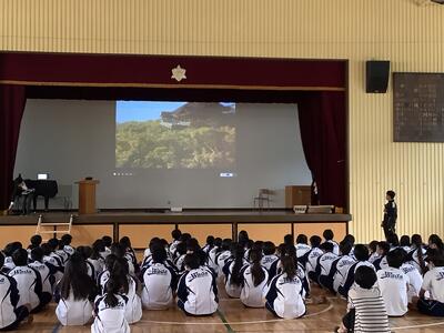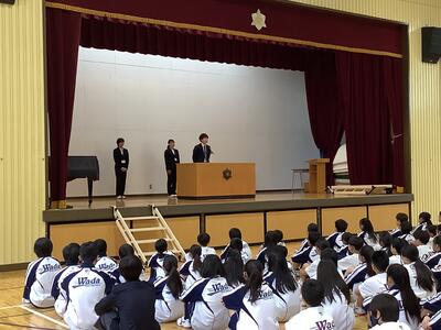 この二ヶ月間の取り組み、人との関わりについて体育大会や教育実習、部活動などを例に確認しました。教育実習生とは最後のお別れをしました。最後に6月は「ふれあい月間」なので、生活指導主任の先生から良好な学校生活について話をしました。