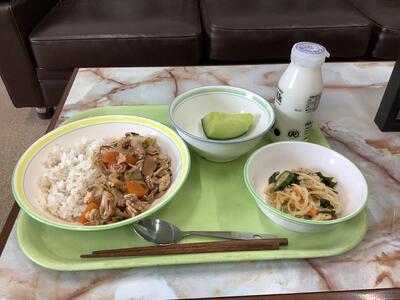 すき焼き丼、千切り大根の胡麻味噌和え、メロン、牛乳です。