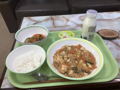 四川豆腐、 中華サラダ、ご飯、ラフランスゼリー、牛乳です。