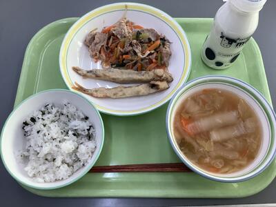 わかめご飯、吉野汁、ししゃもの天ぷら、豚肉と小松菜のピリ辛炒め、牛乳 です。