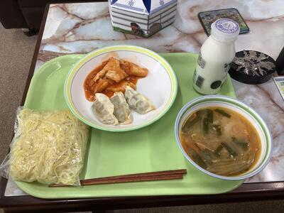 味噌ラーメン、焼き餃子、生揚げチリソース炒め、牛乳です。
