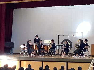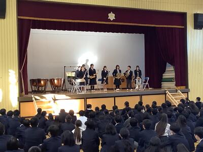 先日のアンサンブルコンテストの演目を全校の前で披露してもらいました。演奏する生徒にも朝突然の話なので、みんなびっくりでしたが、演奏者は心をこめたステージをしました。生徒たちは、温かく歓迎して聴き入っていました。ほんと、素敵な和田中生です。