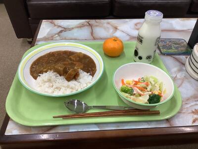 ポークカレーライス、ブロッコリーサラダ、みかん、牛乳です。
