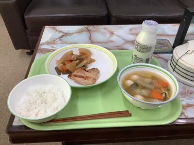 鶏肉の西京焼き、大根とイカの煮物、和風汁、ご飯、牛乳です。
