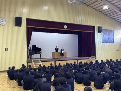 3年生の校歌の指揮伴奏担当者が最後の演奏をしました。1年間ありがとうございました。能登半島の地震や航空機事故についてお悔やみ申し上げます。その後、校長から生成AIの便利さを伝え、真に中学校時代に身に付けるべき力について話しました。水泳の表彰をして終わりました。