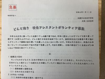 第二地区青少協主催のどんと焼きの準備ボランティア(13日)を募集していましたがたくさんの応募があり喜ばしいことです。14日の当日にモンゴルからのお客様がどんと焼きに参加することになり、そのアテンドのために校長のアシスタントが必要になりましたので募集しています。国際交流に興味のある生徒にお手伝いしてもらえると嬉しいです。