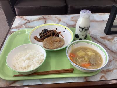 豆腐ハンバーグおろしソース、ひじきの煮物、薩摩汁、ご飯、牛乳です。
