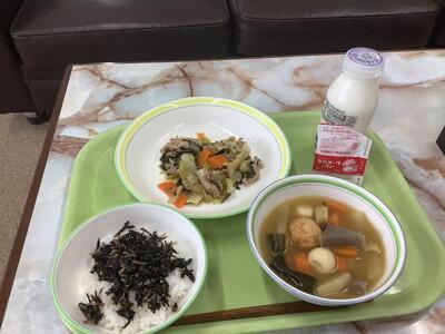 おでん、肉野菜炒め、しそひじきふりかけ、ご飯、いちごミルメーク、牛乳です。