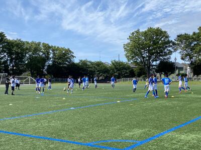 サッカー部の7支部決勝トーナメント二回戦の応援に来ています。我がチームは和田中、東愛宕中、多摩中、聖ヶ丘中の4校合同チームです。対戦相手は市内の諏訪中です。とても暑くなってきました。両チーム全力を出し切ってほしいです。