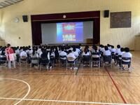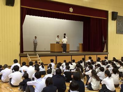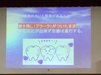 1年生対象に歯科校医さんが歯磨きの大切さを伝えてくれています。