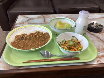 坦々丼、海藻サラダ、メロン、牛乳です。