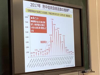 多摩市教育委員会の生活指導主任会に参加していますが、熱中症予防の研修を受けています。市内の全学校、全児童生徒が熱中症にならない夏を過ごしてほしいです。写真のように、もうすぐ来る梅雨明け以降に、「グッ」と熱中症の搬送件数が上がります。十分な栄養、睡眠をとって、暑すぎない環境下で、適切な水分補給を行っていきましょう。