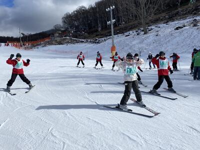 スキー場に向かって出発します!午前午後6時間のレッスンです。