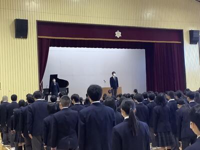 3学期始業式 投稿日時 : 2024/01/09 和田中学校管理者 3年生の校歌の指揮伴奏担当者が最後の演奏をしました。1年間ありがとうございました。能登半島の地震や航空機事故についてお悔やみ申し上げます。その後、校長から生成AIの便利さを伝え、真に中学校時代に身に付けるべき力について話しました。水泳の表彰をして終わりました。 {{options.likeCount}} {{options.likeCount}}