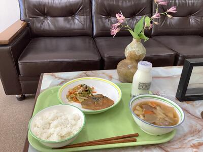 さばの味噌だれ、野菜のおかか炒め、けんちん汁、ご飯、牛乳です。
