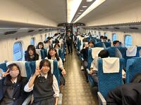 バスで奈良へ向かいます。この後、法隆寺、東大寺、興福寺などを見学します。1号車のバスでは楽しんで過ごす人、ぐっすり眠る人などがいます。