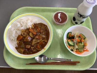 根菜カレーライス、チョレギサラダ(塩ドレッシング)、多摩市産ブルーベリーゼリー、牛乳です。