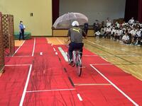多摩中央警察の方から自転車の乗り方を指導をしていただきました。最初の悪い例を生活指導主任が行いました。乗らずに押すことが正解です。