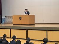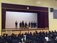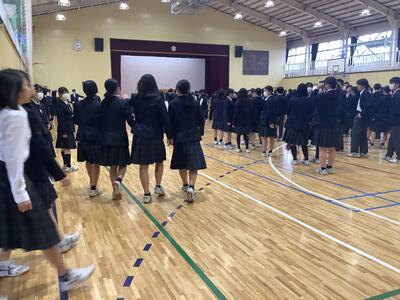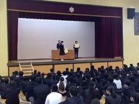 生徒会長からは考査、受験に向けての話とやり残したことやりきろうというメッセージが送られました。そして3月にあいさつ運動があることが伝えられました。生活委員からは身だしなみチェックの話があり、その後に防犯作文、アンサンブルコンテスト、卓球部の表彰をしました。生活指導主任から、今日の朝礼集合の素晴らしさへの御礼があり、その後2月のふれあい月間について、過ごしやすい学校生活について話しました。